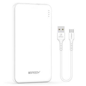 5000mAh 용량에 C타입 케이블 포함된 스피디 슬림핏 보조배터리는 화이트 색상으로 슬림한 디자인으로 휴대가 편리하며 스마트폰 태블릿 등 기기를 외출 시 빠르게 충전할 수 있는 보조 전원 장치이다.