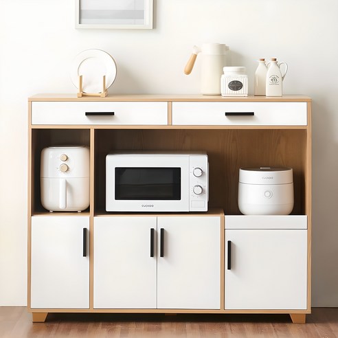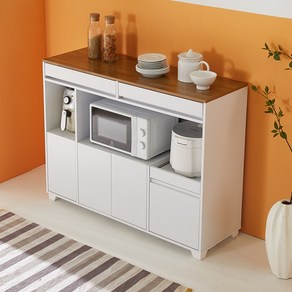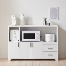화이트 색상으로 주방과 조화롭게 어울리며, 밥솥, 에어프라이어, 전자렌지 등 다양한 주방 가전을 효율적으로 수납할 수 있는 1200 사이즈 멀티 주방 수납장입니다.